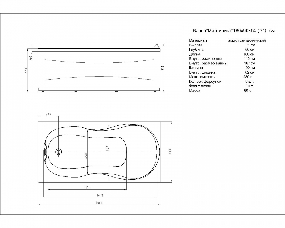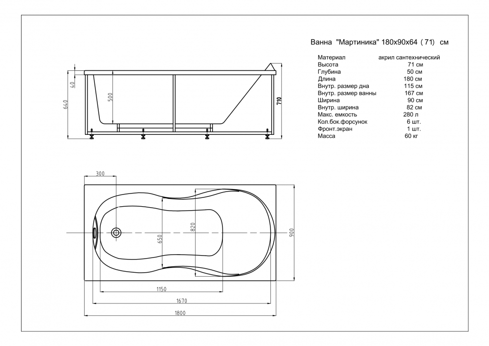 Комплектация*: ванна, каркас, слив-перелив