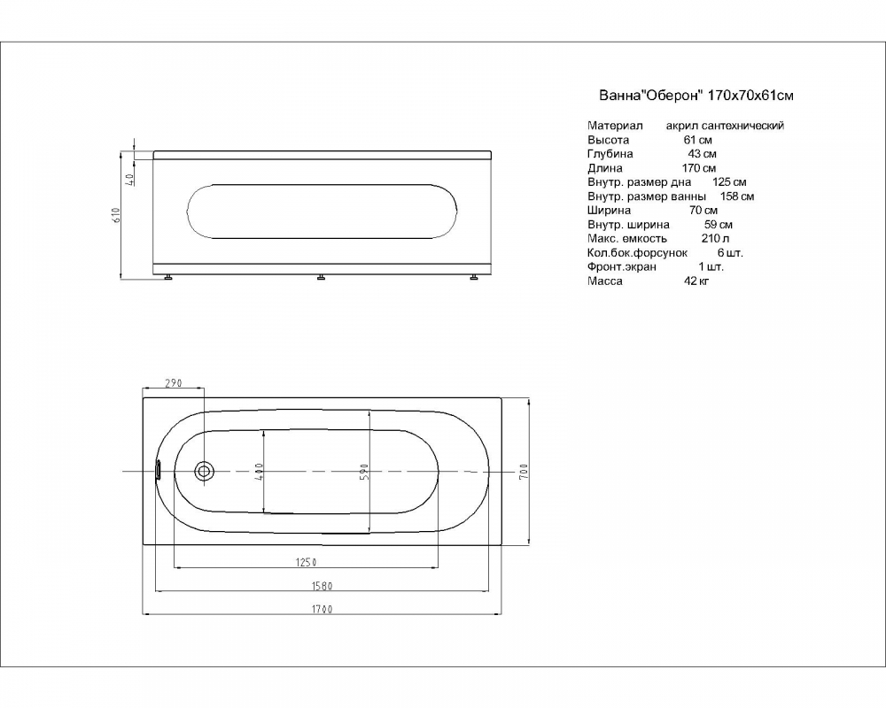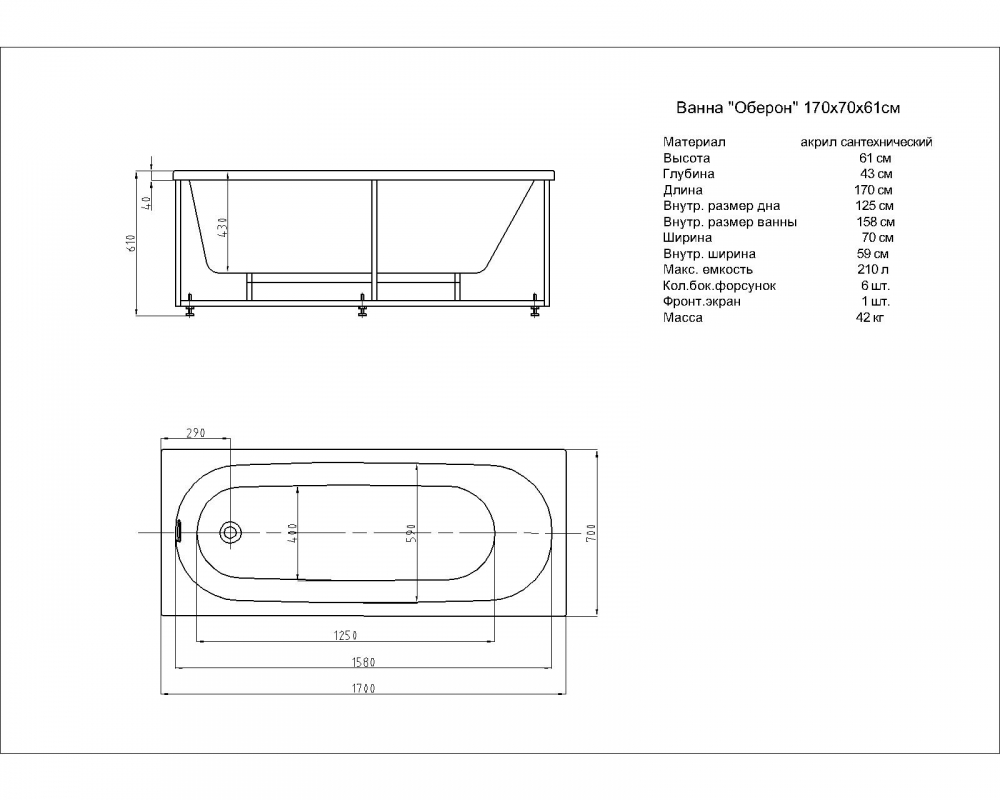 Комплектация*: ванна, каркас, слив-перелив