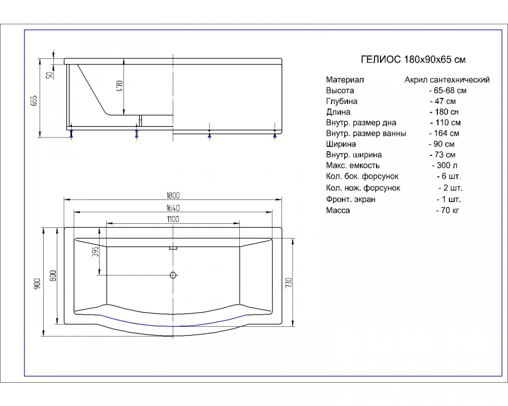 Комплектация*: ванна, каркас, фронтальный экран, слив-перелив
