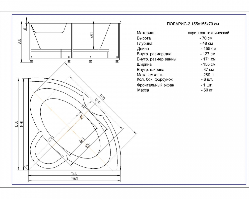 ПодробнееВанна угловая литьевой акрилл (100%) Aquatek ПОЛАРИС-2 155x155